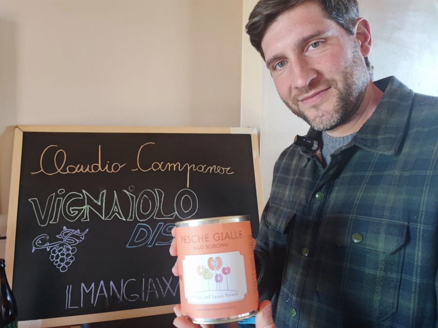Claudio riceve per mano di Giovanni le Pesche sciroppate di Caravate di Alessio Terresan del Sasso Poiano e il salame artigianale di suino nero delle Alpi Retiche e pecora Ciuta dell'azienda agricola Pecora Nera di Sondrio