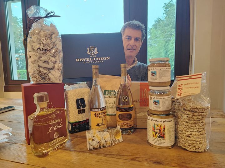 Il titolare della Distilleria Revel Chion 1850 Alberto Carrara "riceve" per mano di Giovanni prodotti gastronomici offerti da aziende agricole visitate con "reportage di foto e video"
