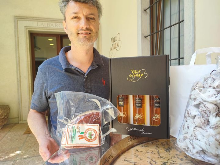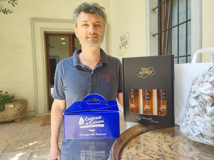 Il maestro distillatore Mauro Dolzan riceve per mano di Giovanni l'omaggio delProsciuttificio Marco D'Oggiona della Brianza1/4 di Prosciutto Crudo 20 Mesi riserva "Dolce" e da parte del Caseificio Latteria di Cameri 1918 una selezione di Gorgonzola D.O.P 90 gg San Giulio Riserva Piccante e il Gorgonzola D.O.P. Dolce