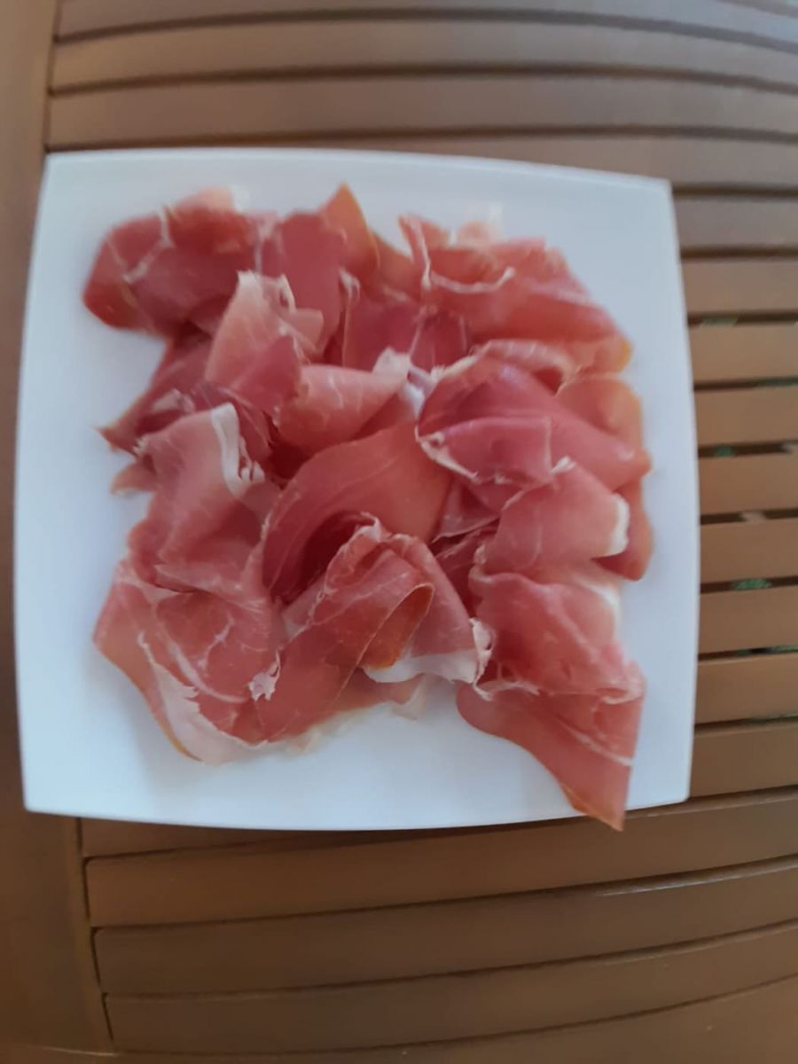 Il taglio è a volano nella sala del ristorante e la fetta tagliata con spessore 1,7mm di consistenza gradevole al tatto asciutto, aspetto: poco grasso sul lato, colore rosato e molto uniforme, lumidità è a norma..al Palato: sapore equilibrato, aromatico e poco salato, profumi piacevoli, non stucchevoli, invitanti...