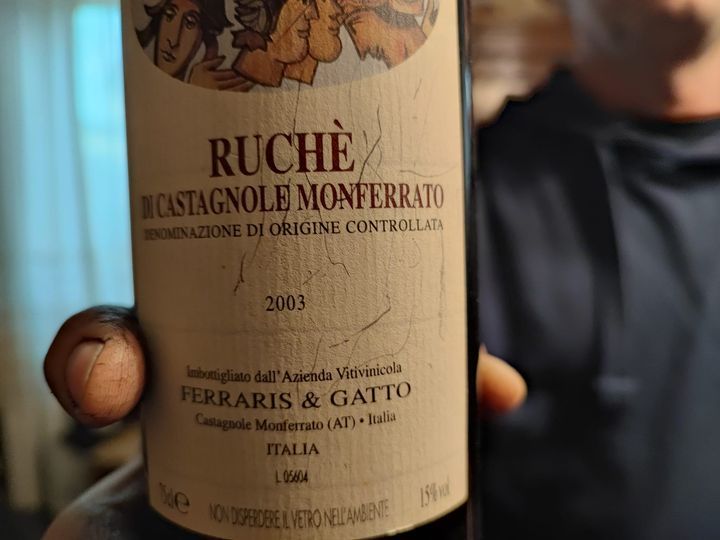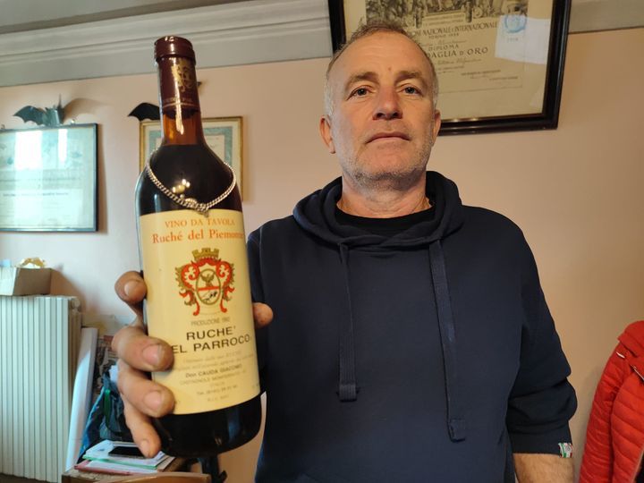 Questa è la bottiglia di vino originale che faceva il parroco Giacomo, me l'ha regalata un mio cliente che dispiaciuto che la mia, datami dal parroco a Pascqua dopo aver servito le tre messe, l'avessi persa, avevo circa 12 anni. Vieni Giovanni ,ti faccio vedere l'etichetta del vino Ruchè prodotta da me e Luca Ferraris agli inizi del 2000, anche questa bottiglia per me un pezzo di storia.