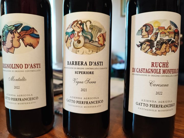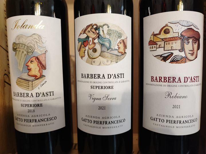 Il maestro pittore attore amato da tutti gli astigiani e non solo, Carlo Carosso, dipinge le etichette di tutte le tipologie di vino del Vignaiolo Pierfrancesco Gatto...