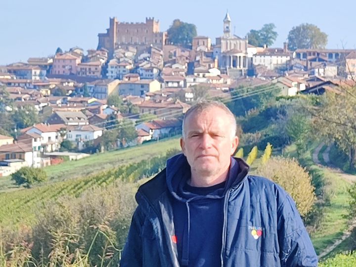 Giovanni ti faccio perdere un pò di tempo e ti porto nella vigna Serra della Barbera. Io ne faccio tre tipologie di Barbera d'asti; una fa solo acciaio, un'altra fa solo,.... sai Giovanni le mie Barbere si avvicinano di più al sud astigiano, sono più concentrate, quà a Montemagno c'è meno sabbia, il terreno e più calcareo, per cui si estrae bene il colore, la struttura la potenza e si perde un pò nei profumi floreali a ragione per i profumi maturi di frutta. Ho circa 3 ettari di vigna Serra a Barbera..