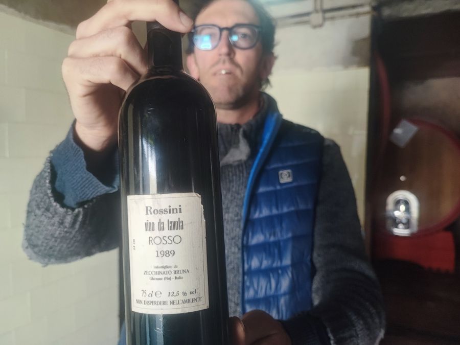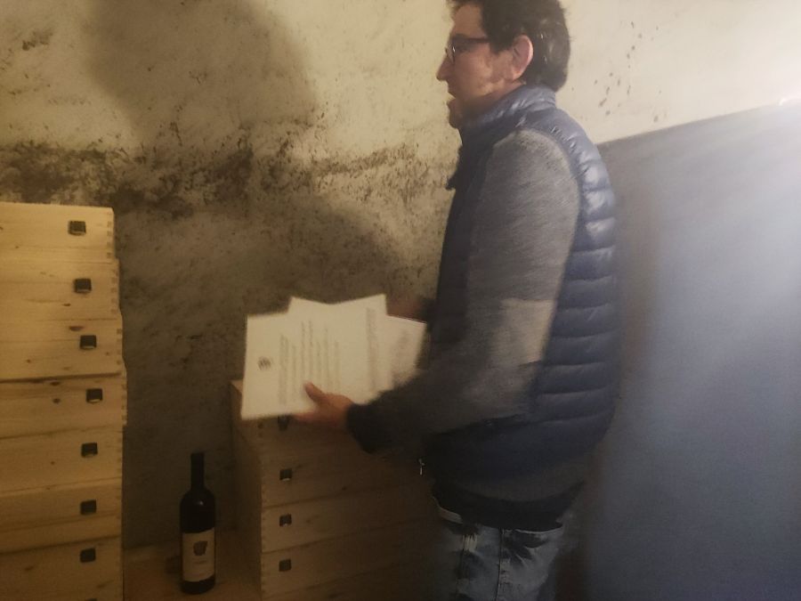 Utilizzo pochissimo solfito andando in protezione previntivamente togliendo ossigeno nelle vasche....poi c'è la sala di stabilizzazione dei vini, li c'è la zona delle vecchie botti rovere di Slavonia dove facciamo affinare, per scelta mia il Nebbiolo e il Ghemme invece per disciplinare, Giovanni quà c'è il caveau delle bottiglie vecchie annate...ti faccio vedere la storica, la prima bottiglia imbottigliata nel 1989 vino da tavola "Rossini"....