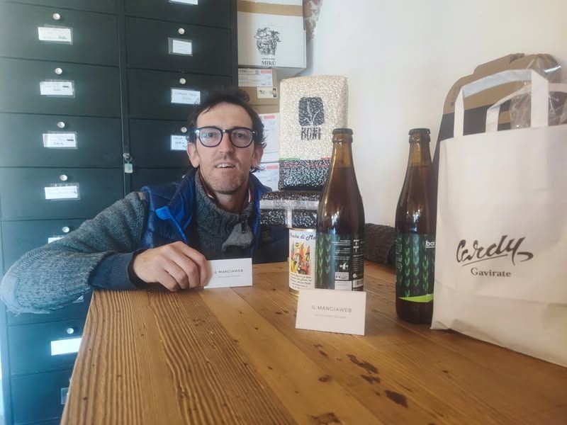 Il maestro enologo vignaiolo Marco Arlunno riceve dalle mani di Giovanni: riso carnaroli, "Riso autentico pavese" del risaiolo Matteo Boni" di Pavia, le Pesche sciroppate dell'azinda agricola Le Selve di Luca Franzetti di Monate Varese, le Birre artigianali del mastro Birrario Orso Verde Cesare di Busto arsizio e per finere i Brutti e buoni di Gavirate della pasticceria Cardy