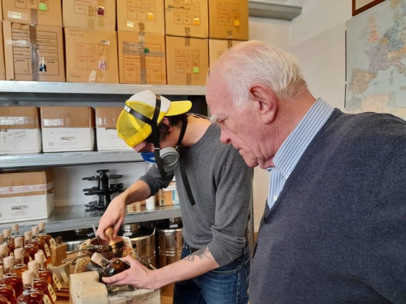 E' il momento dell'imbottigliamento, legatura, sigillo e descrizione precisa per ogni prodotto. Manualità artigiana, anche in questo Vittorio Capovilla si dimostra geniale...Bottiglie numerate uniche ed irrepitibili