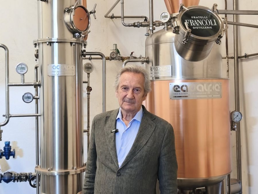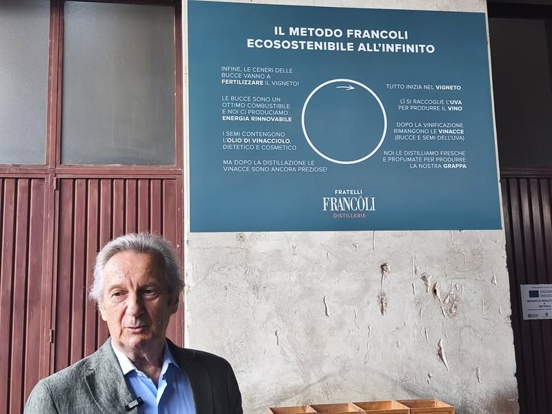 Alla fine dell '800 inizia il percorso di un gruppo di miei prozii, tutti Grapàt, nel proseguio della storia, mio padre Luigi insieme ad altri zii, alla fine della seconda querra mondiale, nel susseguirsi di eventi, incidenti, matrimoni con prole e tante belle cose... Lui, mio padre Luigi Francoli, il Grapàt, che viveva circondato dalle montagne Prestone, Portarezza, Pietra, Tini, Acero, Corti, Fraciscio, Starleggia, Splughetta, Ca’ de Luch, Motta, nella Valle Spluga.....a 1200 di altezza, in un paesino dal nome, Campodolcino nella Valchiavenna in provincia di Sondrio, Terra ignara dei luoghi comuni, Terra dolce come il miele, Terra di bresaole classiche e Terra di bresaole Faraoniche, terra del grande Bitto Storico ribelle ma di pochi vigneti...Il grapàt Luigi emigrava... in inverno andava a cercar chi lo pagava per la sua arte e capacità di distillare....prende a due mani il suo sogno, la sua visione e nel 1954, apre la "distilleria Luigi Francoli" impiantando la prima e unica distilleria a Ghemme, terra di uva sana e pregiata, chiamata Spanna, oggi Nebbiolo; essenza... di una essenza... che diventa, sopravvivenza globale, perchè dopo il suo nobile utilizzo primario, noi della Francoli rianimiamo le vinacce rendendole perfette da distillare e andando ai passaggi sucessivi, la buccia dell'uva viene essiccata, diventando commustibile che ci serve sia per produrre vapore per la distillazione sia per il riscaldamento invernale, i raspi le usiamo per pacciamatura nei vigneti tenendo lontano le erbacce e allo stesso tempo aricchisce il tereno e per finire il seme dell'uva contiene ancora il 18% di olio dacui ricaviamo l'olio di vinacciolo... la rendiamo ancora più utile per l'energia elettrica e la qualità dei fumi e dello stress causato dai mezzi di locomozione... in circa 50 anni siamo riusciti a creare un rapporto di assoluto rispetto per l'ambiente che ci circonda e per chi lavora nel nostro gruppo, questo è il mio Trasporto..infinito..