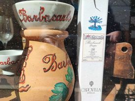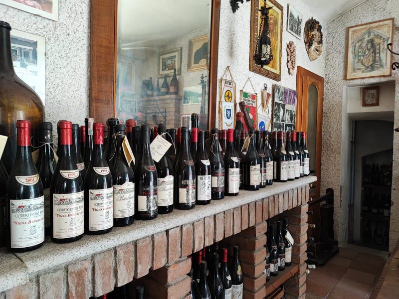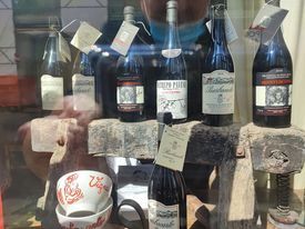 Bottiglie storiche affiancano in vetrina una bottiglia di grappa del maestro Capovilla che distilla anche per conto terzi, in questo caso la vinaccia di Barbacarlo, sarà eccezionale cosa che più tardi mi confermerà Giuseppe che del maestro Capovilla è un grande estimatore...
