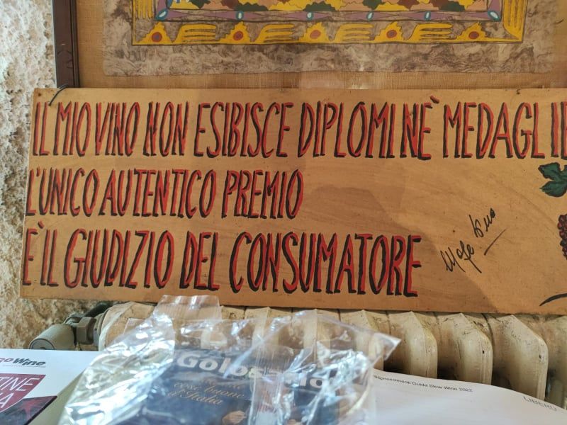 L'aperitivo funziona, ottimo salame prodotto da un suo amico e annata Barbacarlo 2019 a fare da pacere con la sapidità e la dolcezza del grasso del salume, un vino ampio e abboccato, potente e longevo ma soprattutto vero e genuino. Mi muovo nello spazio dedicato agli incontri con amici vignaioli che neltempo vengono a trovarlo portandogli un pensiero un ricordo, si parla di tutto eanche di vino, ci raccontiamo filosofie, di vini naturali, biologici, biodinamici, vinosostenibile, ancestrale, tutta una montagna di aggettivi che creano confusione, nessunoche parla di vino genuino. Come diceva mio padre "Le cose semplici cercano sempredi complicarle"...