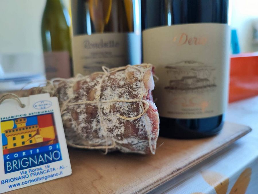 Tra poco scopriremo i vini che il vignaiolo Paolo Poggio ci degustrà. Ci tengo fare una precisazione che Paolo sottolinerà nel corso dell'intervista. A pochi passi dalla sua cantina c'è un salumificio artigianale che produce il Salame Nobile del Giarolo, il negozio si chiama Corte di Brignano, era mia intenzione intervistare la padrona di casa ma c'era molta clientela ed ho rinunciato; alla prossima. Così ho scoperto che per realizzare il loro salame di altissima qualità, il vino rosso lo concede proprio la cantina di Paolo Poggio
