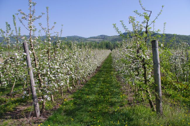 La mia azienda agricola comprende quindici ettari di terreni, di questi cinque coltivati a Vigneti di Timorasso, Barbera, in piccola parte Cortese e Croatina e poi coltivo frutta, in particolare mele di varietà antica per il consumo fresco e produco succhi di frutta 100% mela ma di quantità molto limitata e senza aggiunta di acqua, zuccheri e conservanti.