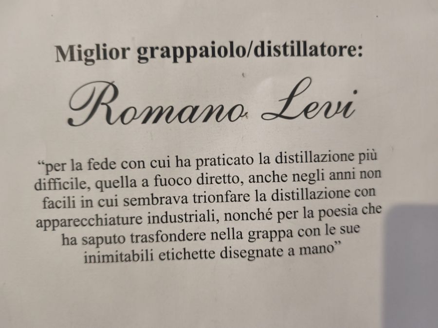 E' stato una persona straordinaria; attirava a Neive una folla di gente che veniva per comprare le sue bottiglie, per conoscerlo, per ammirarlo: ha valorizzato la vinaccia di Arneis, tanto che c'era stupore di quanto fosse buona la vinaccia di questo vitigno e anche il Barbaresco grappa era troppo buona..gli invidiosi dubitavano...doveva per forza averci aggiunto qualcosa. La grappa di Moscato...non ho parole per descriverla "Romano Levi era l'artigiano, stilista della Grappa a fuoco diretto".