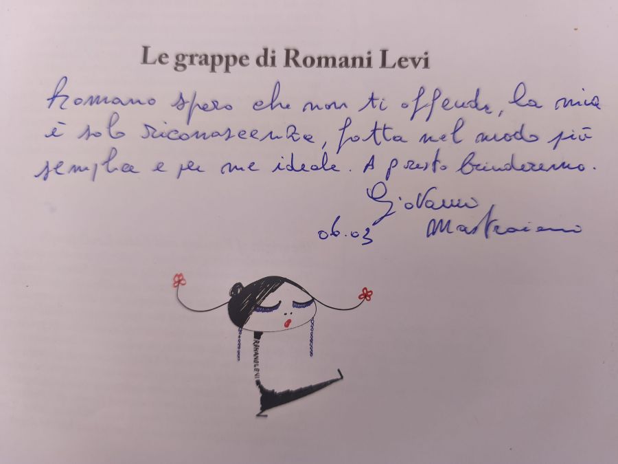 A Romano Levi: per l'arte, il genio che hai saputo trasferire con le tue supreme grappe che scavalicano il paradiso; vocato e dedito alla ricerca della felicità attraverso la distillazione più difficile, a "fuoco diretto" nel cuore della grappa, il trionfo della qualità. La donna selvatica è tua...