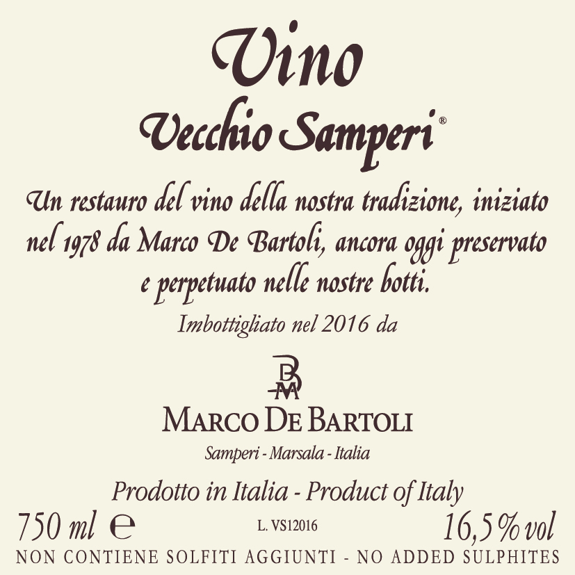3.500 ceppi per ettaro con radici che hanno origini tra il 1970 ed il 1996 nel territorio di C.da Samperi, a Marsala (pianeggiante di medio impasto, sabbioso-calcareo). Piante ad alberello e contro-spalliera Guyot, 20 hl di resa per ettaro vendemmiati l’ultima decade di settembre. Selezione manuale delle uve, spremitura soffice, sedimentazione naturale, fermentazione tradizionale in fusti di rovere e castagno a temperatura ambiente. Invecchiamento per una media di 20 anni, con un’aggiunta del 5% di vino più giovane ogni anno, utilizzando il tradizionale metodo perpetuo